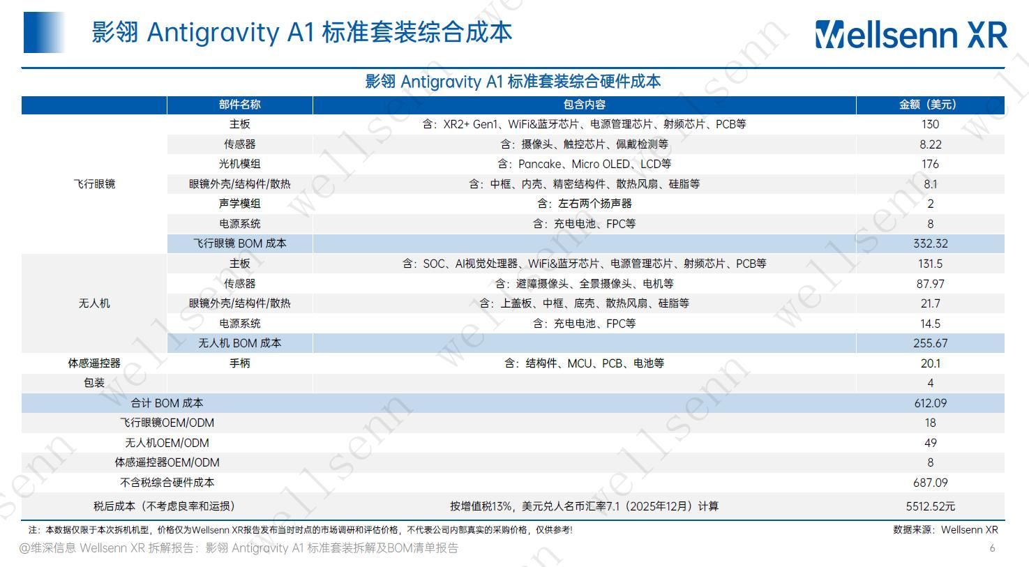 香港, 2026年1月27日 - (亚太商讯) - 影翎 Antigravity A1 标准套装是影石创新发布的全球首款 8K 全景无人机,以全景影像 + 沉浸式 FPV 操控为核心,提供 “一次拍摄、后期自由构图“ 的创新体验。该产品一经发布,广受产业界和消费者的关注,根据近期维深 wellsenn XR发布的报告,影翎 Antigravity A1 标准套装的 BOM 成本约 612.09 美元,综合硬件成本约 687.09 美元,按美元汇率 7、增值税 13% 计算,影翎 Antigravity A1 标准套装的税后综合成本约5512.52 元。