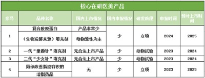 公司自主研发的童颜水凝预期2022年底上市销售;一代“童颜针”填充剂和二代“少女针”填充剂将于2024年上市。